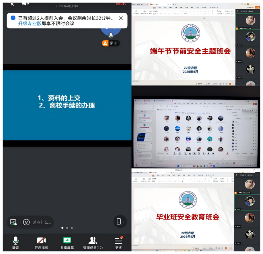(通讯员 陈梦冉)为强化学生假期安全意识,护航毕业生顺利离校,学院于端午节前夕组织全体研究生召开安全教育主题班会。与此同时,本次班会按年级特点定制主题方向,结合班级实际细化内容,通过案例警示、微视频以及互动分享,凝聚班级合力,为毕业生送上“最后一课”温情关怀。