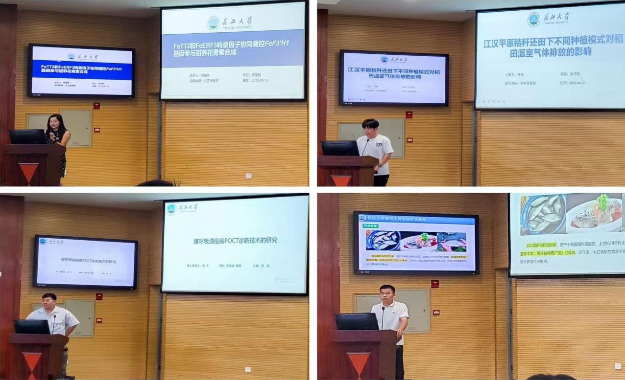 随后,八位主讲人依次登台,结合自身研究领域,带来了一场场精彩纷呈的学术分享。农学院的罗旖柔以《FeTT2和FeERF3转录因子协同调控FeF3'H1基因参与甜荞花青素合成》为题,深入探讨了甜荞花青素合成的分子机制;何锋则聚焦《江汉平原秸秆还田下不同种植模式对稻田温室气体排放的影响》,为农田温室气体减排提供了新思路。动物科学技术学院的杨艳林和张千分别就《浊度对大口黑鲈生长、抗氧化、组织学及视觉功能的影响》和《猪呼吸道疫病POCT诊断技术的研究》进行了精彩汇报,展示了水产养殖和兽医领域的最新进展。
